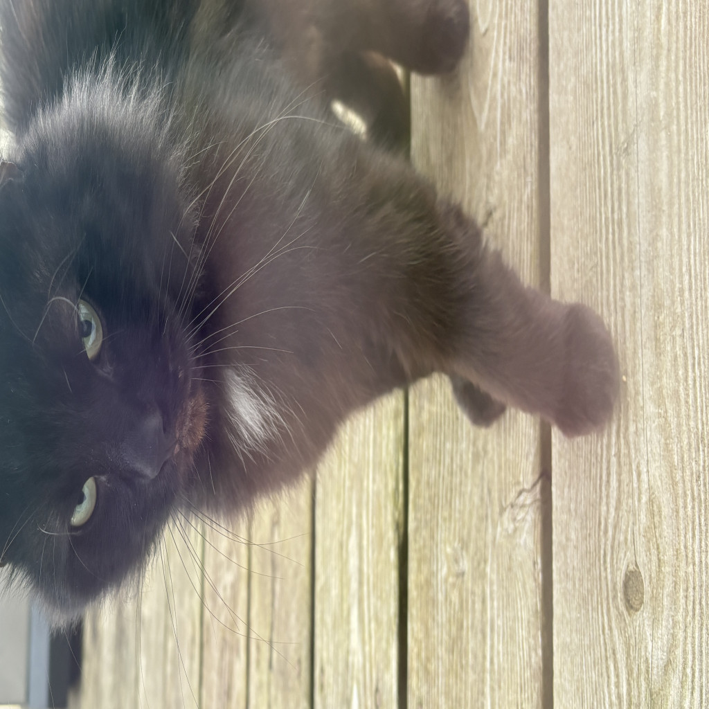 Shes black with a white batch on her chest. She had some brown scattered throughout her fur. She is very skiddish. And unfortunately dealing with what looks like a bad infection.